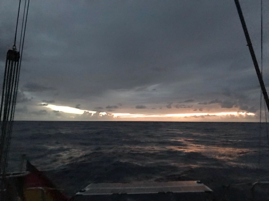 Tag- und Nachtzeit sind ungefähr gleich lang. So wird es früh dunkel und wir versuchen abwechselnd zu schlafen. Einen wirklichen Wachplan haben wir nicht, hatten wir auch noch nie. Das klappt ganz gut. Richtig schlafen kann man ohnehin nicht. Die Bedingungen änderten sich auch auf dieser Reise ständig, sodass es oft Handlungsbedarf gab. So zum Beispiel bei Annäherung dieser Squalls/Sturmböen!