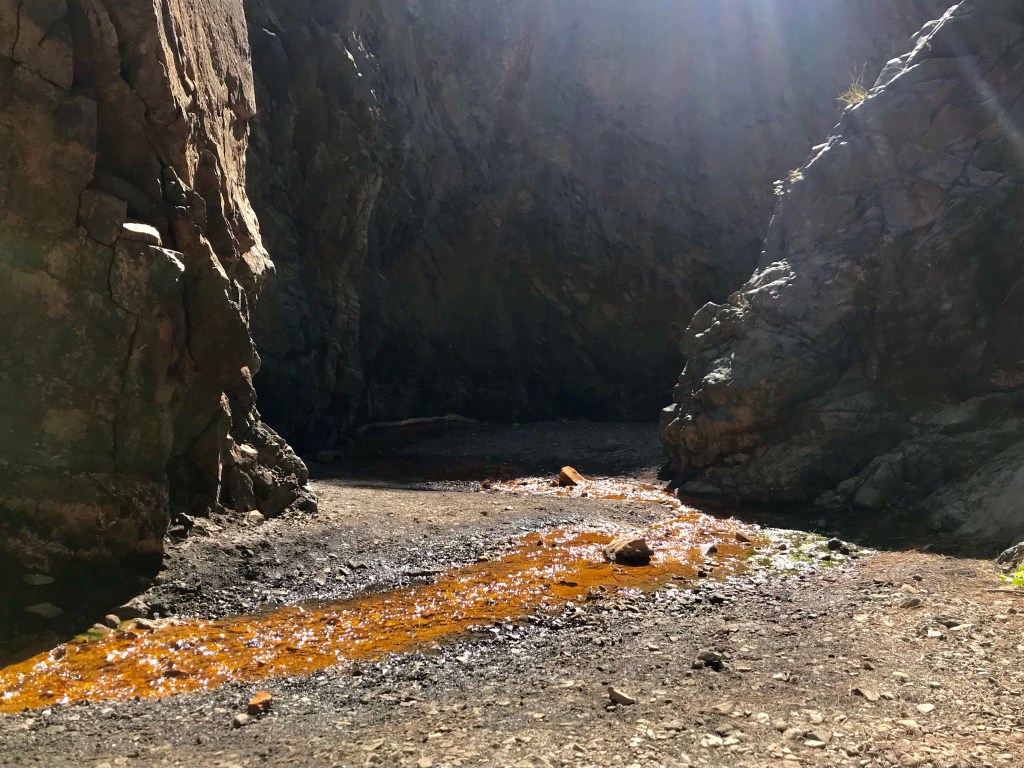 Am Ende des Weges der bunte Wasserfall. Dieser hat seine Farben durch das unterschiedliche Gestein wo das Wasser überfließt. Auf dem Bild links das rötliche- und rechts das ockerfarbene Gestein. Im nachfolgenden Bachlauf wird dann alles zusammen gemischt. Wahnsinn, oder?