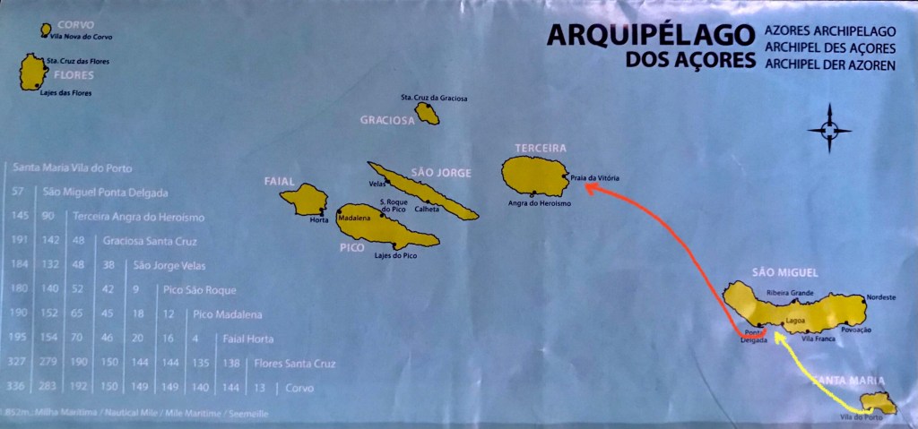 Nun richtet sich unser Blick eine Insel weiter nach „Terceira“. Über 90 Seemeilen ist sie von uns entfernt. (roter Strich) Es wird ein ausgedehnter Tagestörn. Wenn sich die Wettervorhersagen weiter bestätigen, soll es am 23. Mai, früh Morgens losgehen.