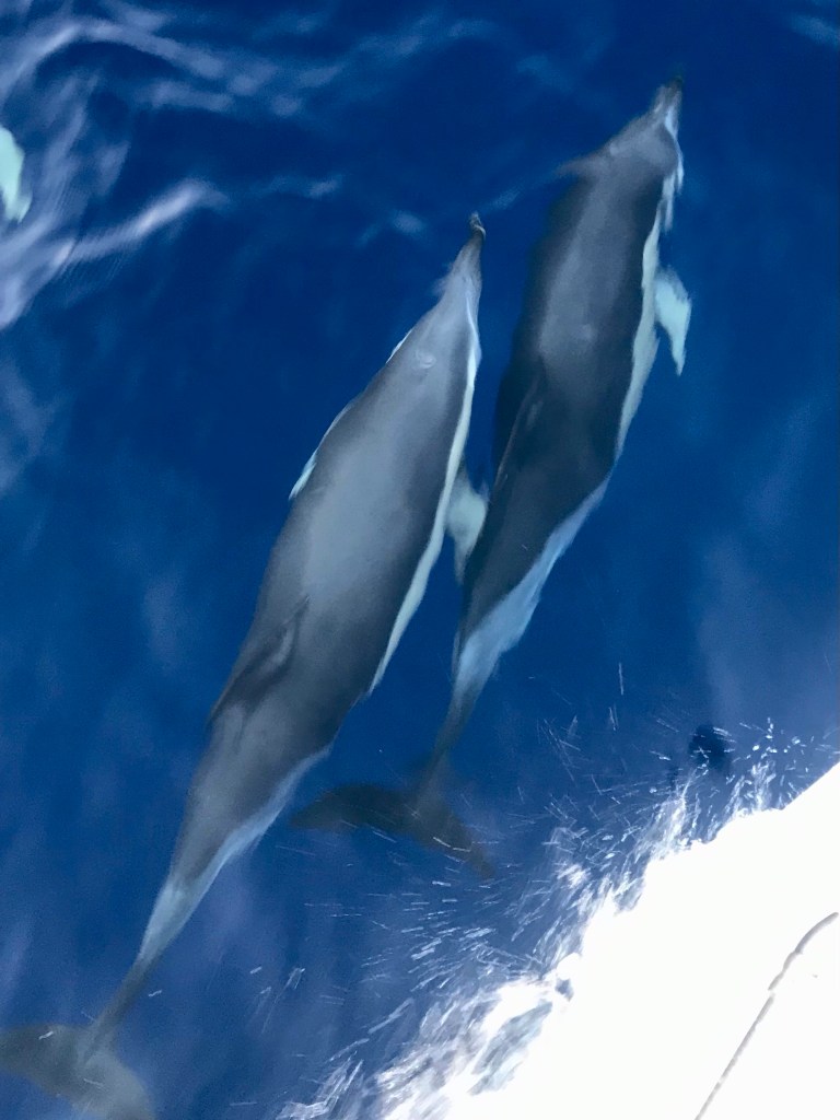Manchmal begleiten sie uns eine Stunde. Die beste Position mit uns zu schwimmen scheint direkt unter unserem Bug zu sein. Um diese Position in der Bugwelle wird sich sogar gestritten. Übrigens auch Nachts! Dann hört man wenn sie atmen.