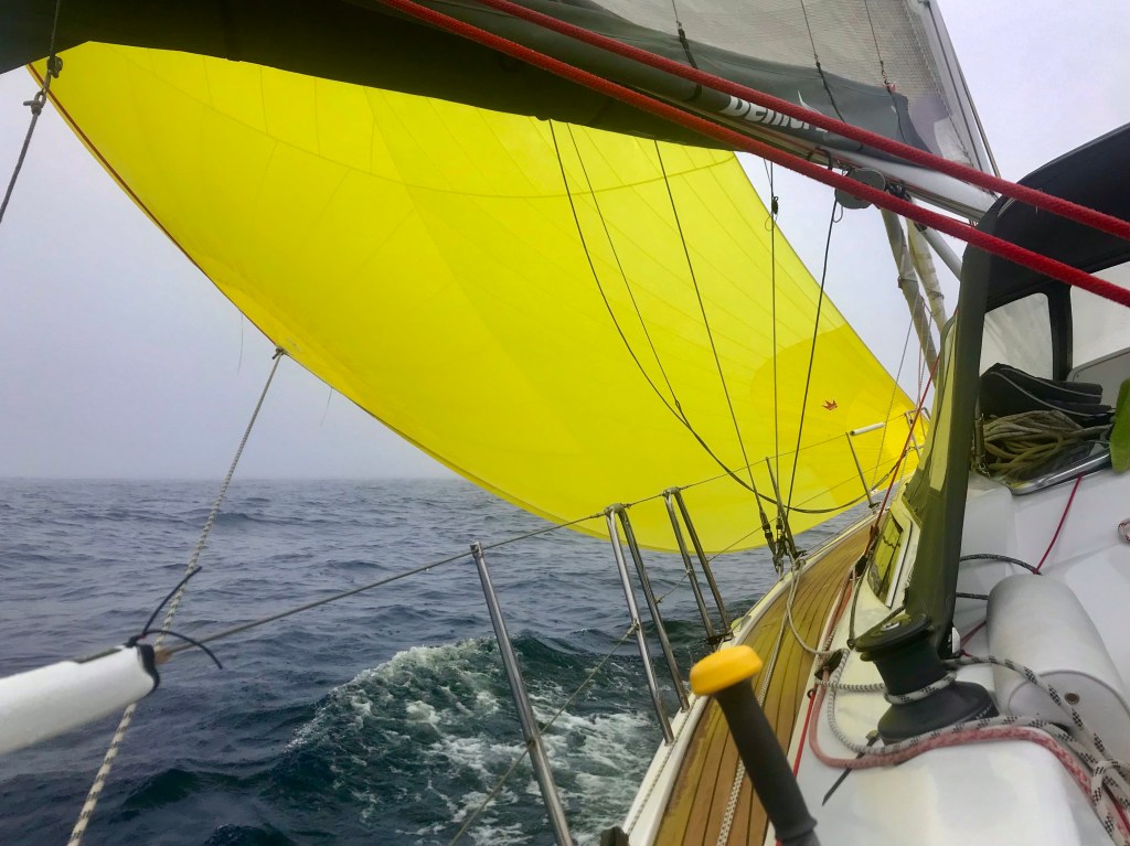 Auch unser Genacker kam zu Einsatz. Mit so viel gelben Tuch holten wir aus wenig Wind noch etwas Speed. Damit konnte der Motor noch eine Weile ausgeschaltet bleiben. Wenn es dann doch zu langsam wird zünden wir den Diesel. Rund 80 Liter haben wir auf dieser langen Etappe verbraucht. Mit unserem Motor wird zusätzlich unsere Batterie geladen und warmes Wasser produziert. Dann ist Geschirr spülen und warmes duschen möglich. Ein echter Luxus!