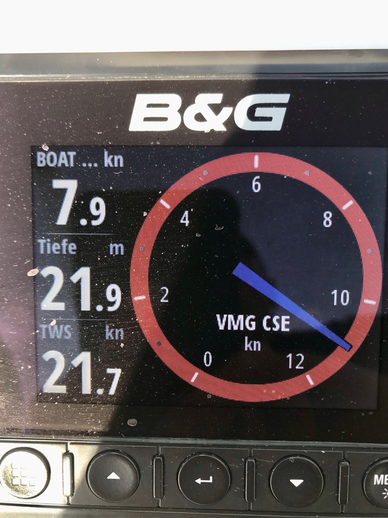 Als alter Regattasegler fällt es mir schwer zu schreiben, wenn uns die Regatten auf unseren „Reisen mit Elisa“ nerven. Ob in Spanien, Portugal oder eben auch hier, erzeugen sie großräumig den Ausnahmezustand in dem wir uns unerwünscht fühlen und somit keinen Platz mehr bekommen. Wir müssen jedes Mal ausweichen. Alles ist dann übervoll. Was uns bei den, immer mehr werdenden, Regatten ärgert ist, dass es zunehmend um Geld geht. Häfen werden dann zu „geschlossenen Gesellschaften“!
