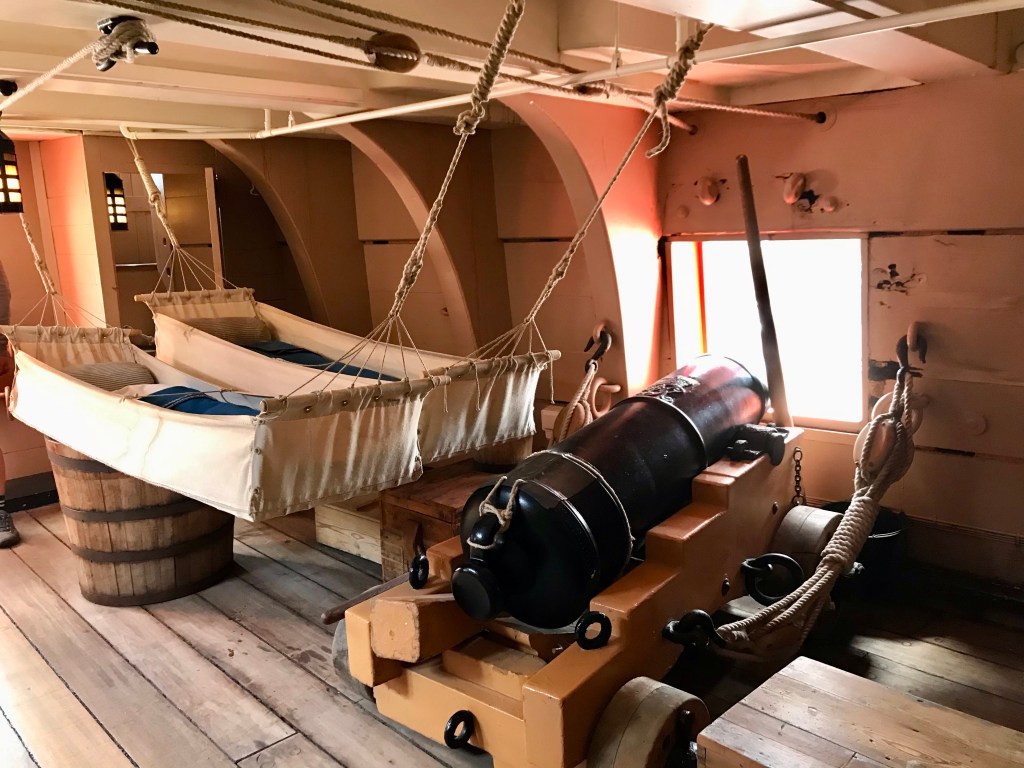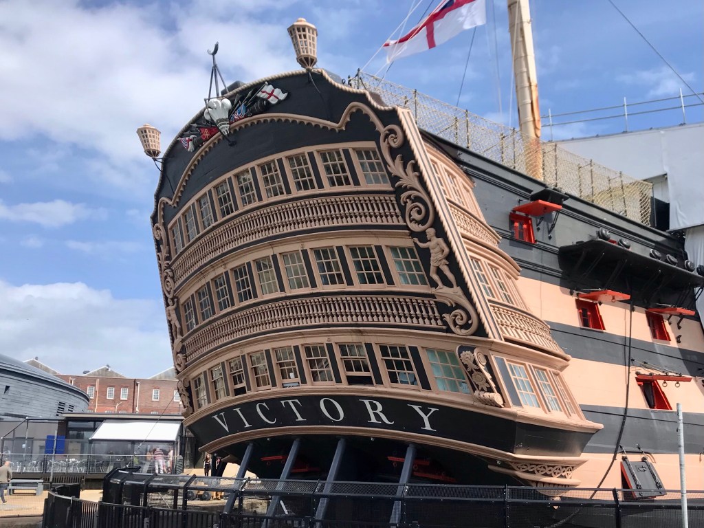Das Museumsschiff „Victory“ steht hier in Portsmouth. Der Besuch war beeindruckend und lohnt sich! Das 70 Meter lange Schiff hat 1805 an der Schlacht um „Trafalgar“ mitgekämpft. Alles furchtbar, wie wir erfahren mußten. Lord Nelson starb dabei.