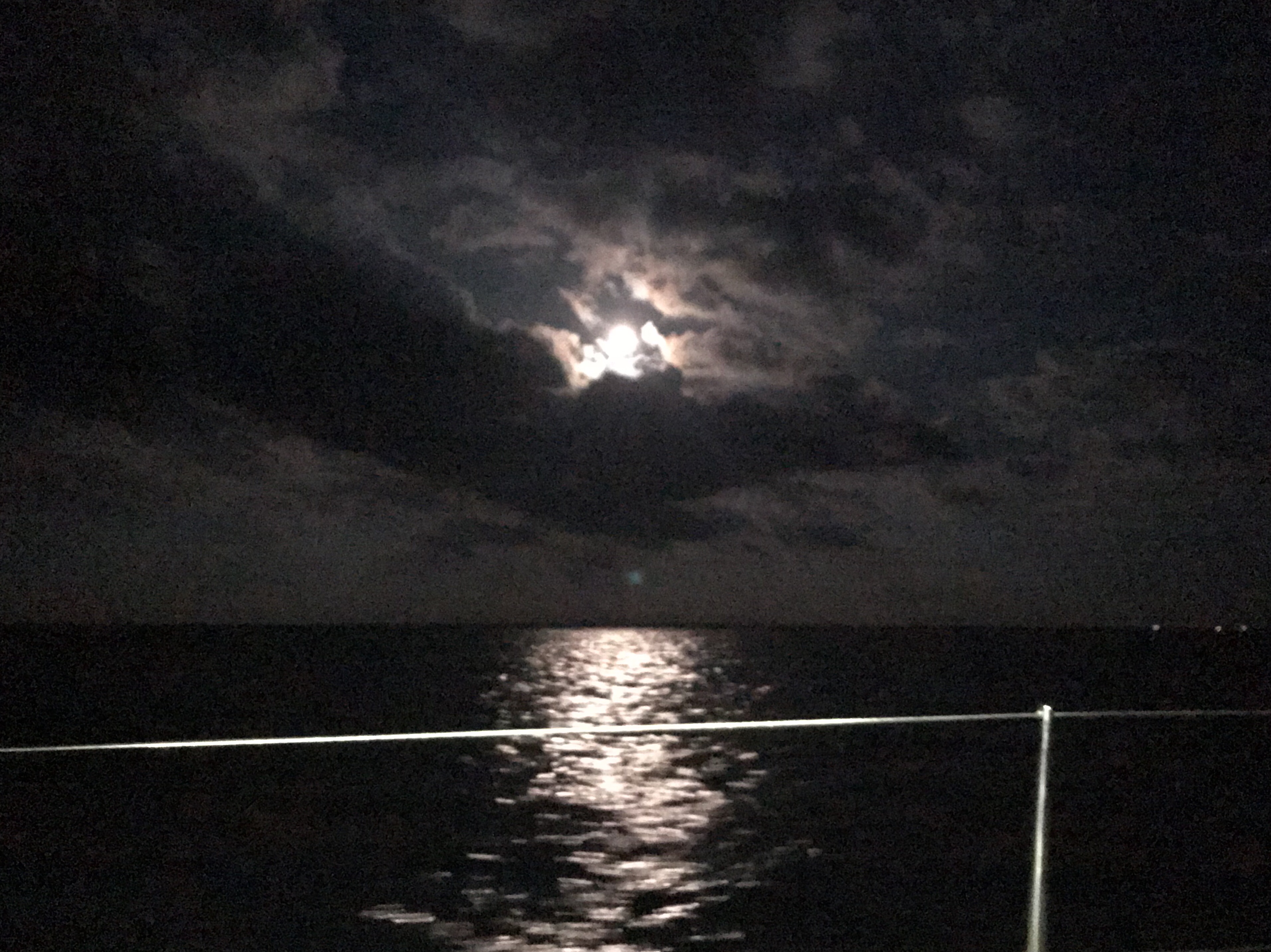 Die Überfahrt war ohne Probleme. Glitzernder Sternenhimmel, Vollmond ab 23 Uhr, eine Gruppe von Orca-Walen, Delphine und die kleine Meeresschildkröte haben uns fasziniert. Der Wind, nicht über 4 Beaufort, kam recht spitz von vorn, bis er dann ganz einschlief und unser Motor zum Einsatz kam. Lange hatte ich ein Zeitfenster zur Überfahrt ausgesucht. Etwas mehr Wind wäre noch schöner gewesen. Aber besser so, als zu viel Wind!